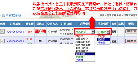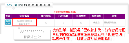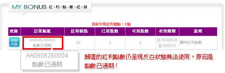 故在會員需知或是購物需知中加註提醒會員,以免造成客訴。若客訴狀況嚴重一定要歸還可用紅利時,您可在後台將該筆訂單處理情形先改為「未處理」再改為「已結案」,則點數便可使用,使用期限依你更改當天為起始日。(因為此動作可能會影響報表及銷售排行,故非必要請勿依此操作) |