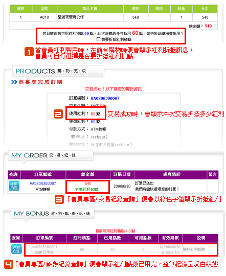啟用紅利積點機制後,前台購物流程中,會顯示「紅利點數」欄位,並於交易時可選擇是否折抵紅利。在會員專區中也可以查詢到紅利點數紀錄。後台在「商品資料登錄」「
